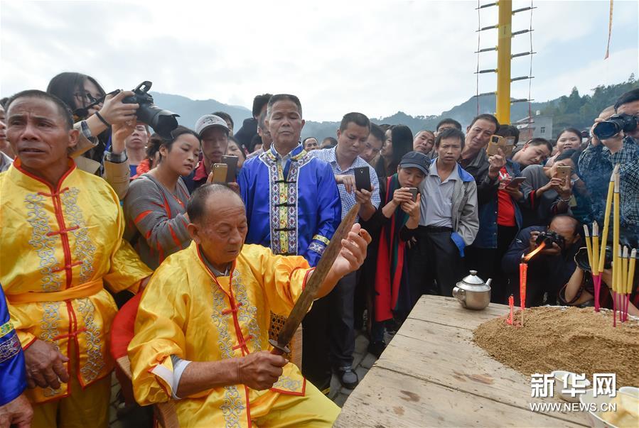 農(nóng)歷十月十五前后,福建西部武平縣各山村陸續(xù)進入農(nóng)閑時節(jié)。按照當?shù)仫L俗,不同村子各自擇日舉辦民間活動,其中較有代表性的就是“上刀山”絕技。“上刀山”絕技在閩西山村流傳已有數(shù)百年歷史,表演者需光腳順著磨得鋒利閃亮的36把鋼刀,攀登至8米高的杉木柱子頂部,接受長者祝福,祈求風調(diào)雨順、五谷豐登。新華社記者 宋為偉 攝
