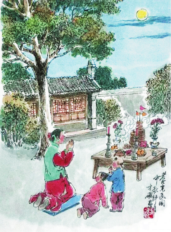 “中秋月。月到中秋偏皎潔?!辟p月是中秋節(jié)的重要習俗,我國民間的中秋賞月活動約始于魏晉時期,盛于唐朝,當時許多名篇佳作中都有詠月的詩句。北宋時期,以賞月活動為中心的中秋節(jié)已成為普遍的民俗節(jié)日,然而與唐代不同的是,宋代關(guān)于賞月的作品多是感物傷懷,以陰晴圓缺喻人情世態(tài)。宋代的中秋夜是不眠之夜,夜市通宵營業(yè),游人絡(luò)繹不絕,《東京夢華錄》中載:“中秋節(jié)前,諸店皆賣新酒,貴家結(jié)飾臺榭,民家爭占酒樓玩月,笙歌遠聞千里,嬉戲連坐至曉?!币恍┑胤缴踔亮鱾鳌爸星镆乖酵硭介L壽”的說法,于是有了守夜的習俗。守夜時,家里長輩通常會給小孩講關(guān)于月亮的故事,如嫦娥奔月、吳剛伐桂等,孩子們個個聽得津津有味。