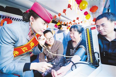列車(chē)工作人員為旅客量血壓/人民日?qǐng)?bào)記者賀勇攝