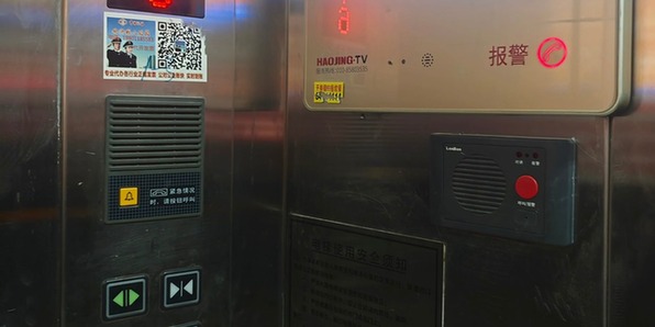 第三個按鈕則位于電梯轎廂的廣告顯示屏上,看得出來這是新近安裝的。顯示屏的右下角有一個“報警”的電話按鈕,這個紅色按鈕始終保持著常亮的狀態(tài)。通過操作指南了解到,如果想要緊急呼叫,需要按下紅色按鈕,等待語音提示結(jié)束再長按按鈕,接通之后就可以直接通話求助了。記者通過測試發(fā)現(xiàn),這個按鈕可以正常撥通求助電話,并且在撥通之后,廣告顯示屏上的廣告會變成實時監(jiān)控畫面。