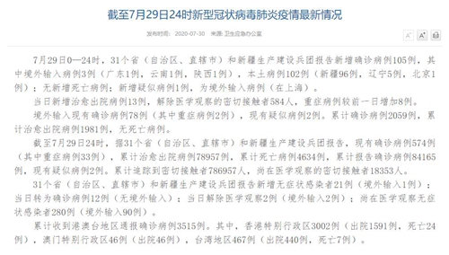 人民網(wǎng)北京7月30日電(董童)國家衛(wèi)生健康委于今日在官網(wǎng)發(fā)布的《截至7月29日24時新型冠狀病毒肺炎疫情最新情況》(以下簡稱“情況”)提出,7月29日0—24時,31個?。ㄗ灾螀^(qū)、直轄市)和新疆生產(chǎn)建設(shè)兵團報告新增確診病例105例,其中境外輸入病例3例(廣東1例,云南1例,陜西1例),本土病例102例(新疆96例,遼寧5例,北京1例);無新增死亡病例;新增疑似病例1例,為境外輸入病例(在上海)。當日新增治愈出院病例13例,解除醫(yī)學(xué)觀察的密切接觸者584人,重癥病例較前一日增加8例。