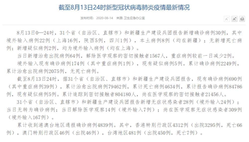 情況顯示,截至8月13日24時,據(jù)31個?。ㄗ灾螀^(qū)、直轄市)和新疆生產(chǎn)建設(shè)兵團(tuán)報告,現(xiàn)有確診病例690例(其中重癥病例39例),累計治愈出院病例79462例,累計死亡病例4634例,累計報告確診病例84786例,現(xiàn)有疑似病例5例。累計追蹤到密切接觸者804180人,尚在醫(yī)學(xué)觀察的密切接觸者21456人。