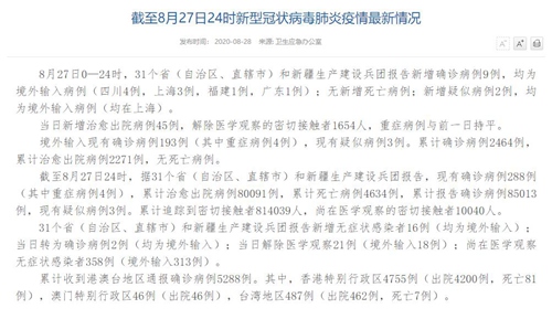 情況顯示,截至8月27日24時(shí),據(jù)31個(gè)省(自治區(qū)、直轄市)和新疆生產(chǎn)建設(shè)兵團(tuán)報(bào)告,現(xiàn)有確診病例288例(其中重癥病例4例),累計(jì)治愈出院病例80091例,累計(jì)死亡病例4634例,累計(jì)報(bào)告確診病例85013例,現(xiàn)有疑似病例3例。累計(jì)追蹤到密切接觸者814039人,尚在醫(yī)學(xué)觀(guān)察的密切接觸者10040人。