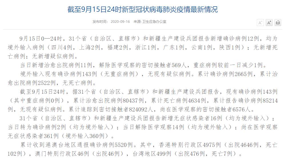 情況顯示,截至9月15日24時(shí),據(jù)31個(gè)?。ㄗ灾螀^(qū)、直轄市)和新疆生產(chǎn)建設(shè)兵團(tuán)報(bào)告,現(xiàn)有確診病例143例(其中重癥病例0例),累計(jì)治愈出院病例80437例,累計(jì)死亡病例4634例,累計(jì)報(bào)告確診病例85214例,無(wú)現(xiàn)有疑似病例。累計(jì)追蹤到密切接觸者824092人,尚在醫(yī)學(xué)觀察的密切接觸者6576人。