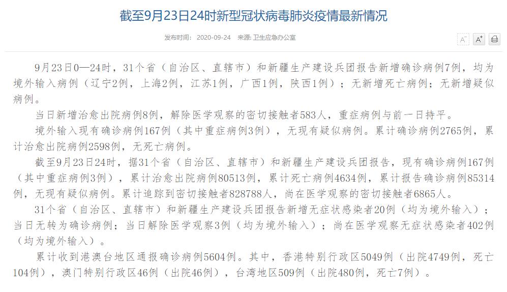 截至9月23日24時(shí),據(jù)31個(gè)?。ㄗ灾螀^(qū)、直轄市)和新疆生產(chǎn)建設(shè)兵團(tuán)報(bào)告,現(xiàn)有確診病例167例(其中重癥病例3例),累計(jì)治愈出院病例80513例,累計(jì)死亡病例4634例,累計(jì)報(bào)告確診病例85314例,無(wú)現(xiàn)有疑似病例。累計(jì)追蹤到密切接觸者828788人,尚在醫(yī)學(xué)觀察的密切接觸者6865人。