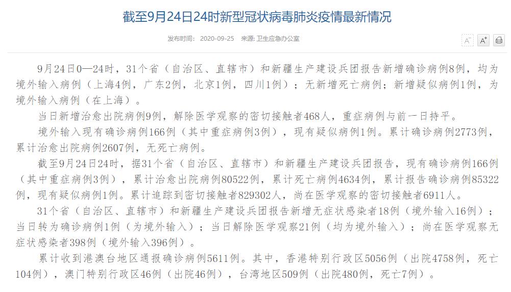 人民網(wǎng)北京9月25日電(董童)國家衛(wèi)生健康委于今日在官網(wǎng)發(fā)布的《截至9月24日24時新型冠狀病毒肺炎疫情最新情況》(以下簡稱“情況”)顯示,9月24日0—24時,31個?。ㄗ灾螀^(qū)、直轄市)和新疆生產(chǎn)建設(shè)兵團報告新增確診病例8例,均為境外輸入病例(上海4例,廣東2例,北京1例,四川1例);無新增死亡病例;新增疑似病例1例,為境外輸入病例(在上海)。當日新增治愈出院病例9例,解除醫(yī)學觀察的密切接觸者468人,重癥病例與前一日持平。