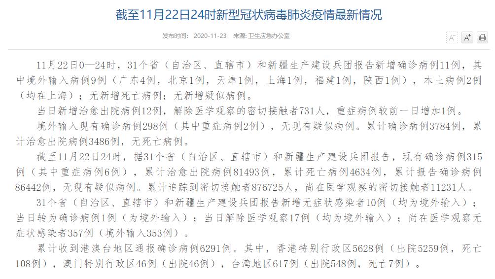 情況顯示,截至11月22日24時,據(jù)31個省(自治區(qū)、直轄市)和新疆生產(chǎn)建設(shè)兵團(tuán)報告,現(xiàn)有確診病例315例(其中重癥病例6例),累計(jì)治愈出院病例81493例,累計(jì)死亡病例4634例,累計(jì)報告確診病例86442例,無現(xiàn)有疑似病例。累計(jì)追蹤到密切接觸者876725人,尚在醫(yī)學(xué)觀察的密切接觸者11231人。