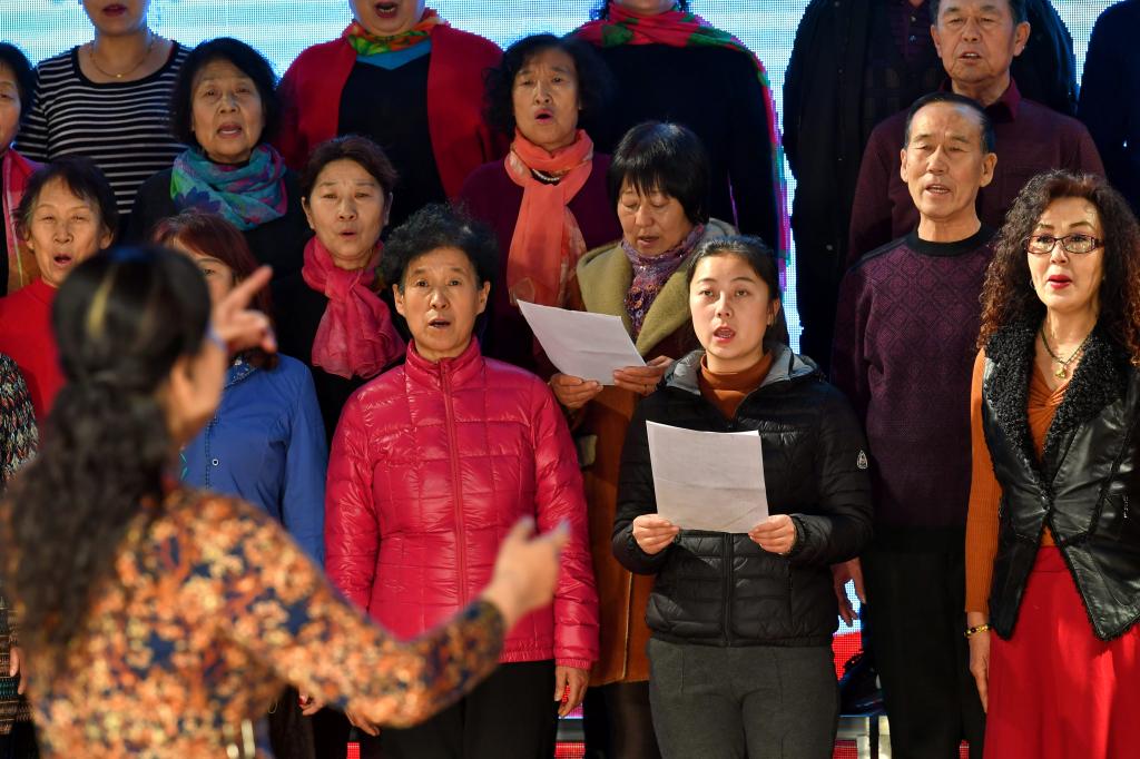 ↑1月3日,在山西省渾源縣荊莊村,渾源縣貧困山區(qū)合唱團(tuán)在表演合唱《紅梅贊》。