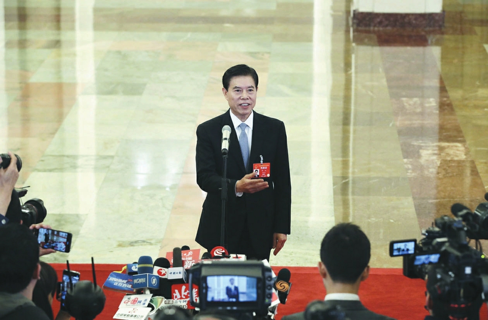 3月5日上午,十三屆全國人大二次會議開幕會結(jié)束后,第二場“部長通道”舉行。銀保監(jiān)會主席郭樹清、商務(wù)部部長鐘山、交通運(yùn)輸部部長李小鵬、工信部部長苗圩、海關(guān)總署署長倪岳峰、國家市場監(jiān)管總局局長張茅、農(nóng)業(yè)農(nóng)村部部長韓長賦、國臺辦主任劉結(jié)一先后亮相,回應(yīng)熱點(diǎn)問題。