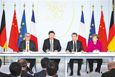 3月26日,國(guó)家主席習(xí)近平在巴黎同法國(guó)總統(tǒng)馬克龍一道出席中法全球治理論壇閉幕式。德國(guó)總理默克爾、歐盟委員會(huì)主席容克應(yīng)邀出席。