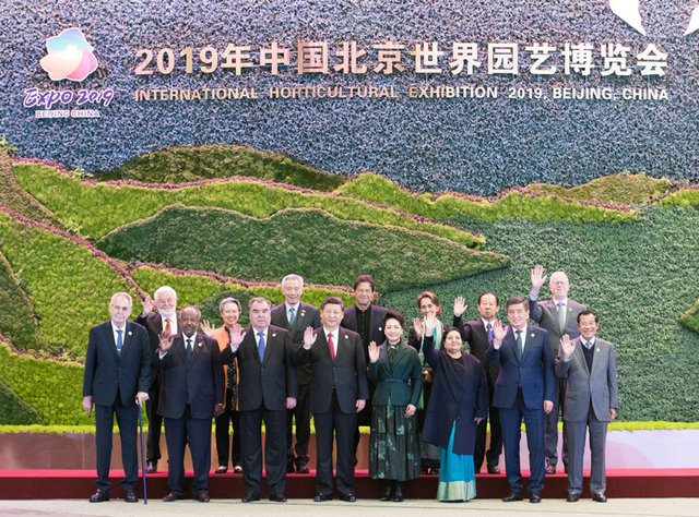 4月28日,國家主席習(xí)近平在北京延慶出席2019年中國北京世界園藝博覽會開幕式,并發(fā)表題為《共謀綠色生活,共建美麗家園》的重要講話。這是開幕式前,習(xí)近平和夫人彭麗媛同參加開幕式的外方領(lǐng)導(dǎo)人集體合影。新華社記者 黃敬文 攝