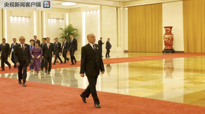 △前來與習(xí)近平會面的柬埔寨國王西哈莫尼。(央視記者許永松拍攝)