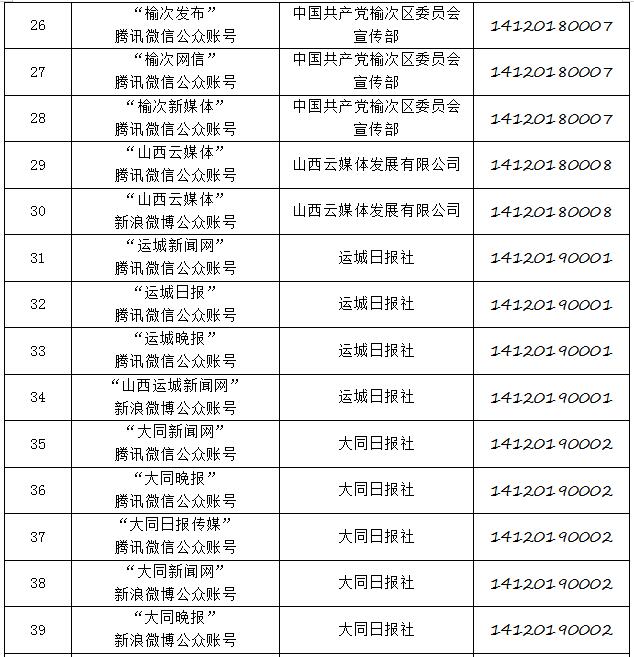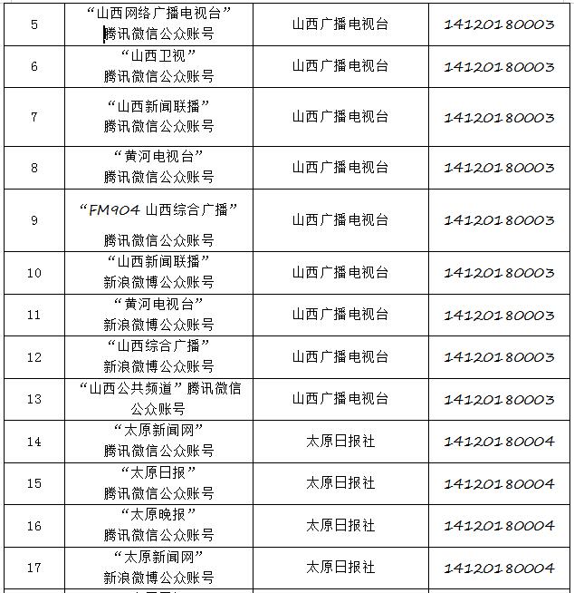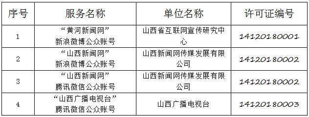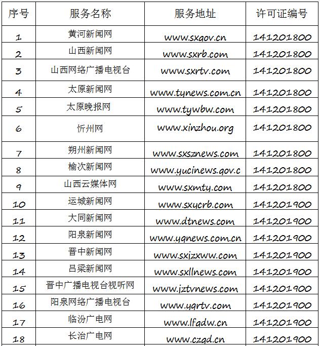 截至2019年8月6日,經(jīng)山西省互聯(lián)網(wǎng)信息辦公室許可的屬地互聯(lián)網(wǎng)新聞信息服務(wù)單位共計(jì)32家,具體服務(wù)形式包括:互聯(lián)網(wǎng)站33個(gè),應(yīng)用程序23個(gè),論壇1個(gè),公眾賬號(hào)112個(gè),共計(jì)169個(gè)服務(wù)項(xiàng)。