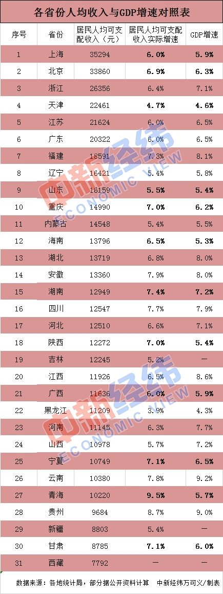 中新經(jīng)緯客戶端梳理發(fā)現(xiàn),2019年上半年,上海、北京、天津、山東、重慶、海南、湖南、陜西、廣西、寧夏、青海、甘肅等12省份居民人均可支配收入的實際增速超過了當(dāng)?shù)氐腉DP增速。其中青海人均可支配收入實際增速比GDP高了3.8個百分點(diǎn),陜西人均可支配收入實際增速比GDP高了1.6個百分點(diǎn)。
