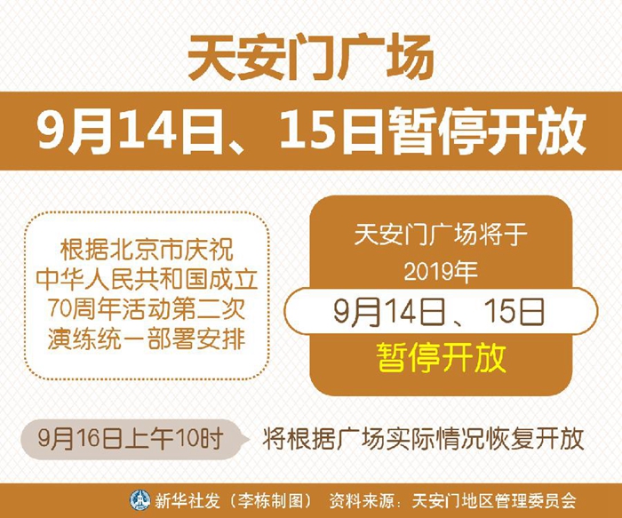 天安門廣場9月14日、15日暫停開放