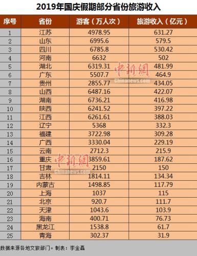 2019年國慶假期部分省份旅游收入