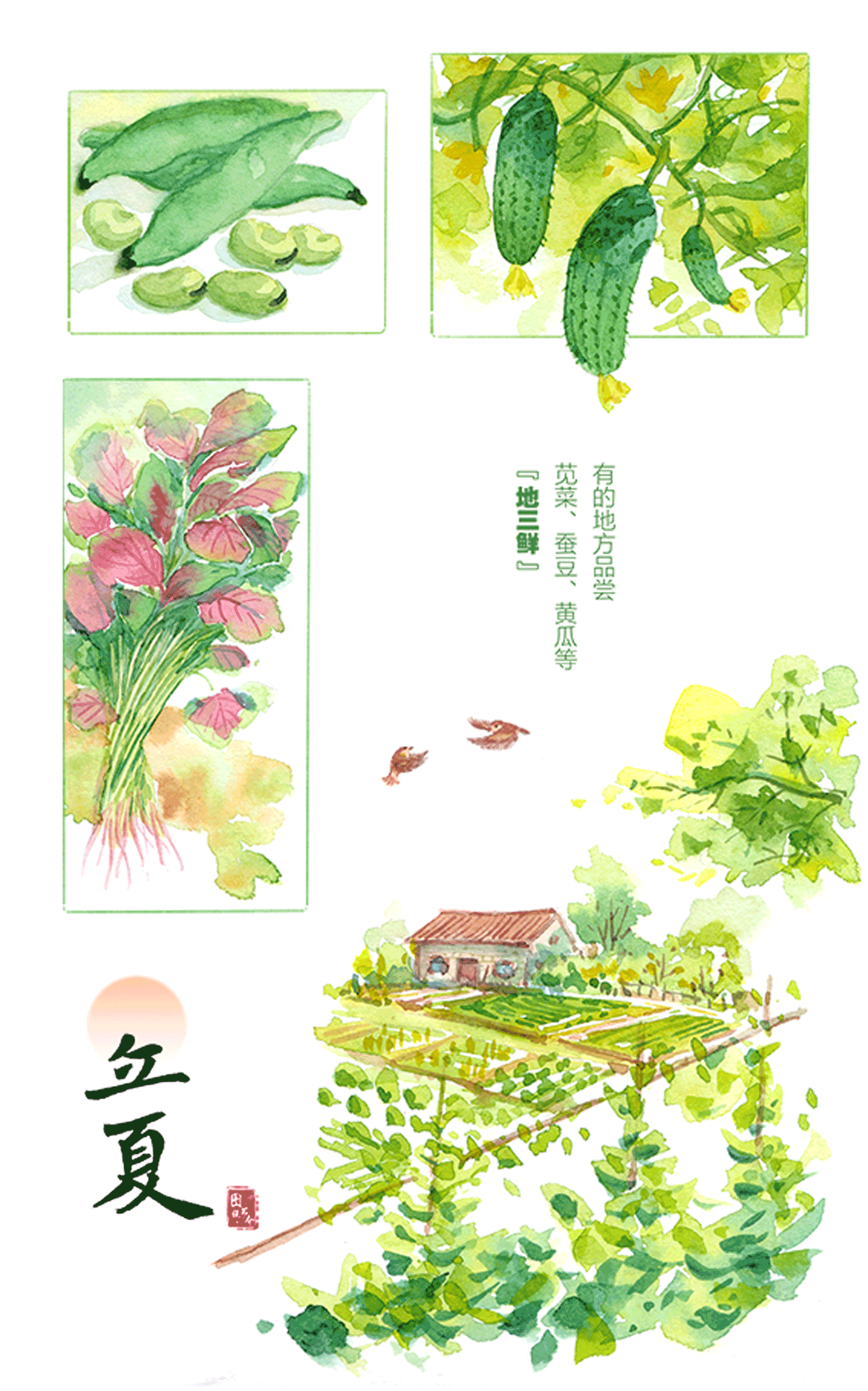 民間素有“立夏嘗三新”的習(xí)俗?!啊隆部梢哉f‘三鮮’,至于‘三鮮’的具體內(nèi)容,各地大同小異,彰顯了民間食俗的多樣性和豐富性?!?/p>