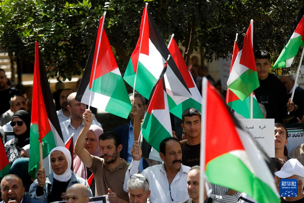 ??9月23日,在約旦河西岸城市希伯倫,民眾揮舞巴勒斯坦旗幟參加慶祝活動。新華社發(fā)(馬蒙·沃茲沃茲攝)