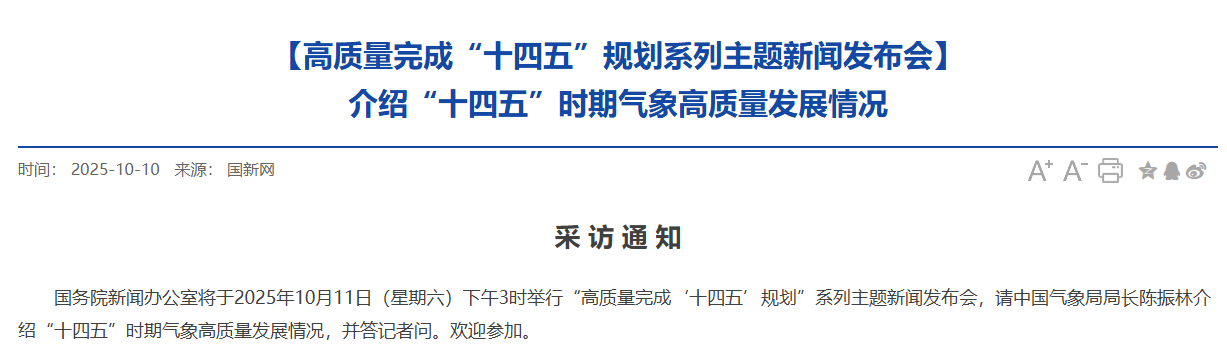 國(guó)務(wù)院新聞辦公室將于2025年10月11日(星期六)下午3時(shí)舉行“高質(zhì)量完成‘十四五’規(guī)劃”系列主題新聞發(fā)布會(huì),請(qǐng)中國(guó)氣象局局長(zhǎng)陳振林介紹“十四五”時(shí)期氣象高質(zhì)量發(fā)展情況,并答記者問。