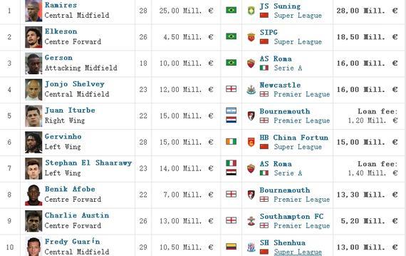 截至目前,中國(guó)俱樂(lè)部球員轉(zhuǎn)會(huì)費(fèi)(含轉(zhuǎn)入及轉(zhuǎn)出)排名前10位的分別是拉米雷斯(2800萬(wàn)歐元)、埃爾克森(1850萬(wàn)歐元)、熱爾維尼奧(1500萬(wàn)歐元)、高拉特(1500萬(wàn)歐元)、保利尼奧(1400萬(wàn)歐元)、登巴巴(1300萬(wàn)歐元)、瓜林(1200萬(wàn)歐元)、吉安(1200萬(wàn)歐元)、畢津浩(1114萬(wàn)歐元)、阿蘭(1110萬(wàn)歐元),1100萬(wàn)歐元轉(zhuǎn)會(huì)費(fèi)的球員進(jìn)不了前10位,這在一年之前是不可想象的。而像格烏瓦尼奧(1100萬(wàn)歐元)、張鷺(980萬(wàn)歐元)、孫可(920萬(wàn)歐元)、巴里奧斯(850萬(wàn)歐元)、吉爾(850萬(wàn)歐元)、孔卡(820萬(wàn)歐元)、奧古斯托(800萬(wàn)歐元)、蒙蒂略(750萬(wàn)歐元)、迪亞曼蒂(690萬(wàn)歐元)都被擠出了前10位。