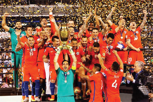 6月26日,智利隊(duì)門(mén)將布拉沃(前左一)在頒獎(jiǎng)儀式上捧杯慶祝奪冠。當(dāng)日,2016年百年美洲杯決賽在美國(guó)新澤西舉行,智利隊(duì)與阿根廷隊(duì)在120分鐘內(nèi)0比0戰(zhàn)平,智利隊(duì)在點(diǎn)球大戰(zhàn)中以4比2戰(zhàn)勝阿根廷隊(duì),奪得冠軍。