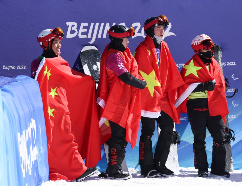 四面五星紅旗分別披在四位選手身上,他們享受著來(lái)自場(chǎng)內(nèi)四面八方的歡呼。他們的名字是紀(jì)立家、王鵬耀、朱永鋼、張義琦,他們是北京冬殘奧會(huì)殘奧單板滑雪男子障礙追逐UL級(jí)比賽大決賽的全部四名參賽選手,冠亞季殿軍獲得者。