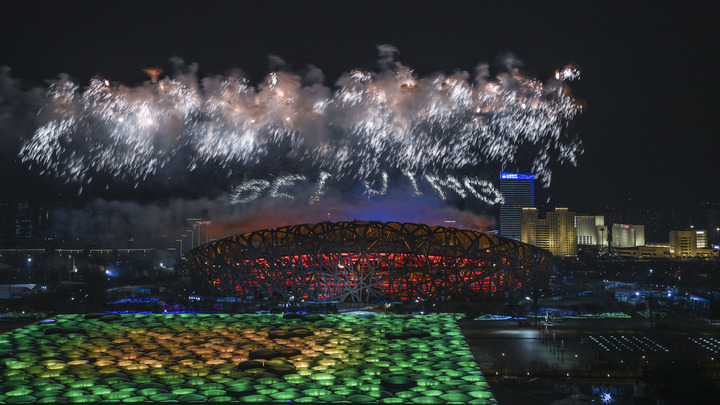 浪漫的焰火騰空而起,“北京2022”在國家體育場上空粲然綻放,時光的“留聲機”定格在大地上。