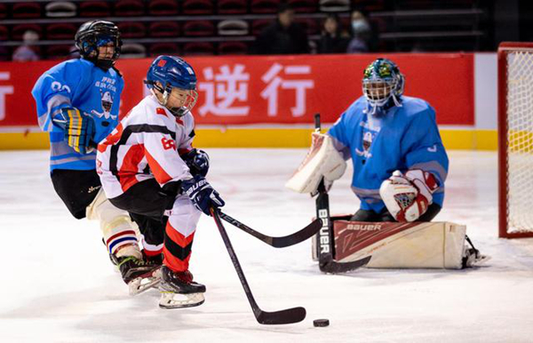 2021年12月29日,在內(nèi)蒙古呼和浩特市體育中心,冰球小選手在比賽中拼搶。新華社發(fā)(丁根厚攝)