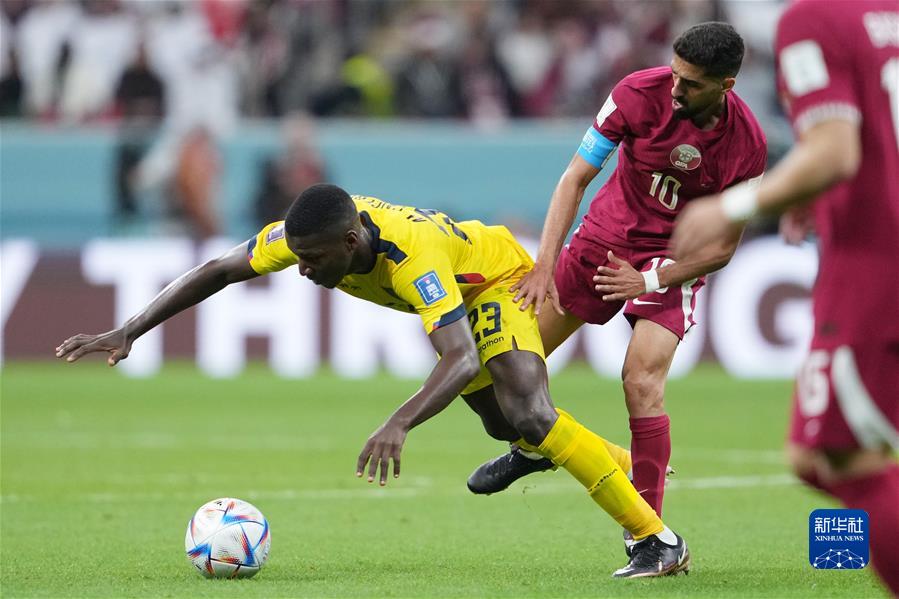 11月20日,厄瓜多爾隊(duì)球員莫伊塞斯·凱塞多(左)與卡塔爾隊(duì)球員哈桑·海多斯在比賽中拼搶。新華社記者 鄭煥松 攝