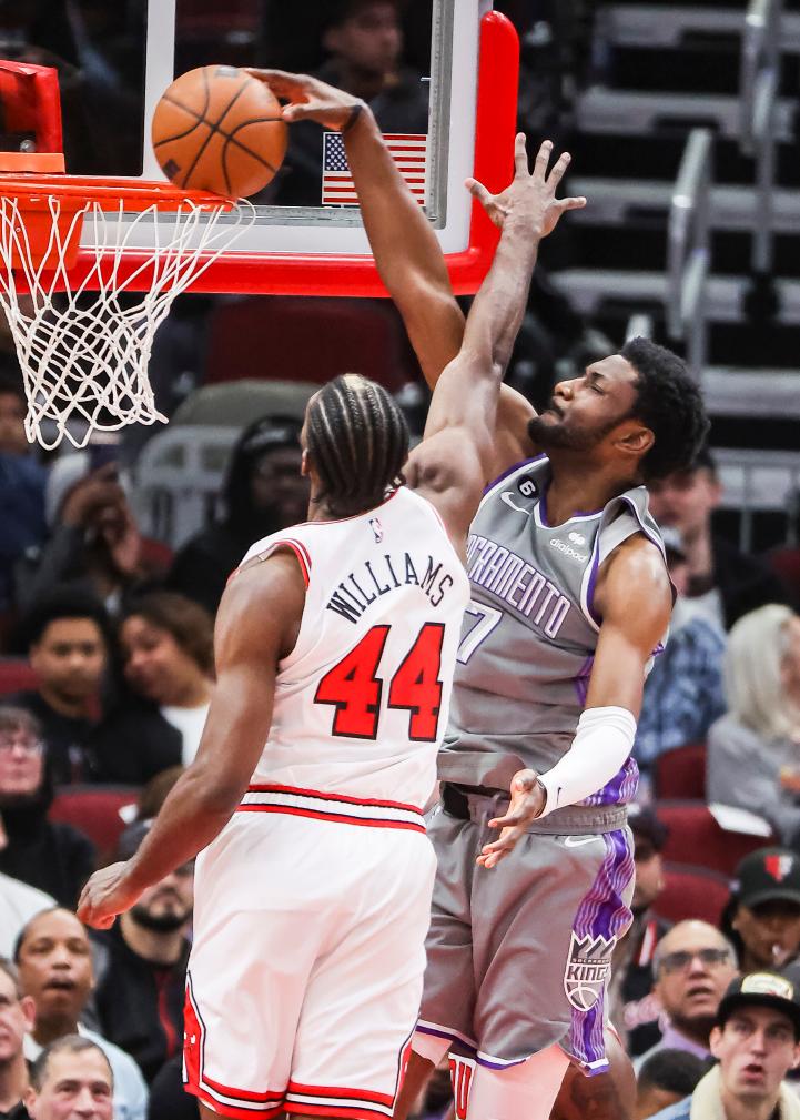 3月15日,效力于薩克拉門(mén)托國(guó)王隊(duì)的愛(ài)德華茲(右)在比賽中扣籃。當(dāng)日,在2022-2023賽季NBA常規(guī)賽中,薩克拉門(mén)托國(guó)王隊(duì)客場(chǎng)以117:114戰(zhàn)勝芝加哥公牛隊(duì)。新華社發(fā)(喬爾·萊納攝)