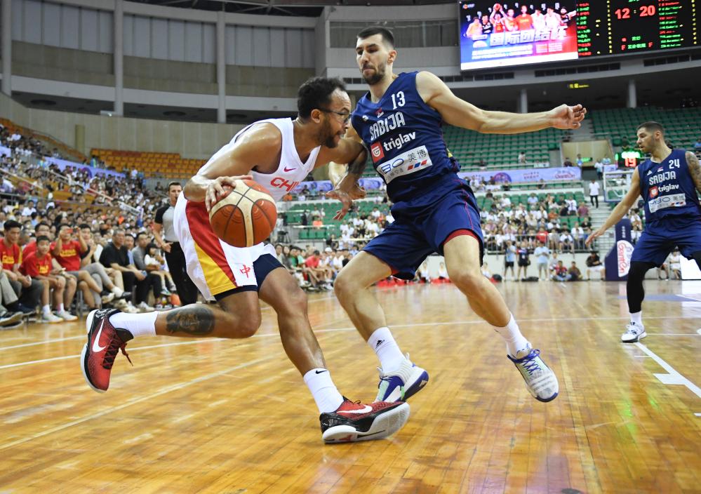 8月20日,在深圳舉辦的中國(guó)隊(duì)對(duì)戰(zhàn)塞爾維亞隊(duì)的國(guó)際團(tuán)結(jié)杯籃球賽中,中國(guó)隊(duì)球員李凱爾(左)的突破瞬間。新華社記者 毛思倩 攝