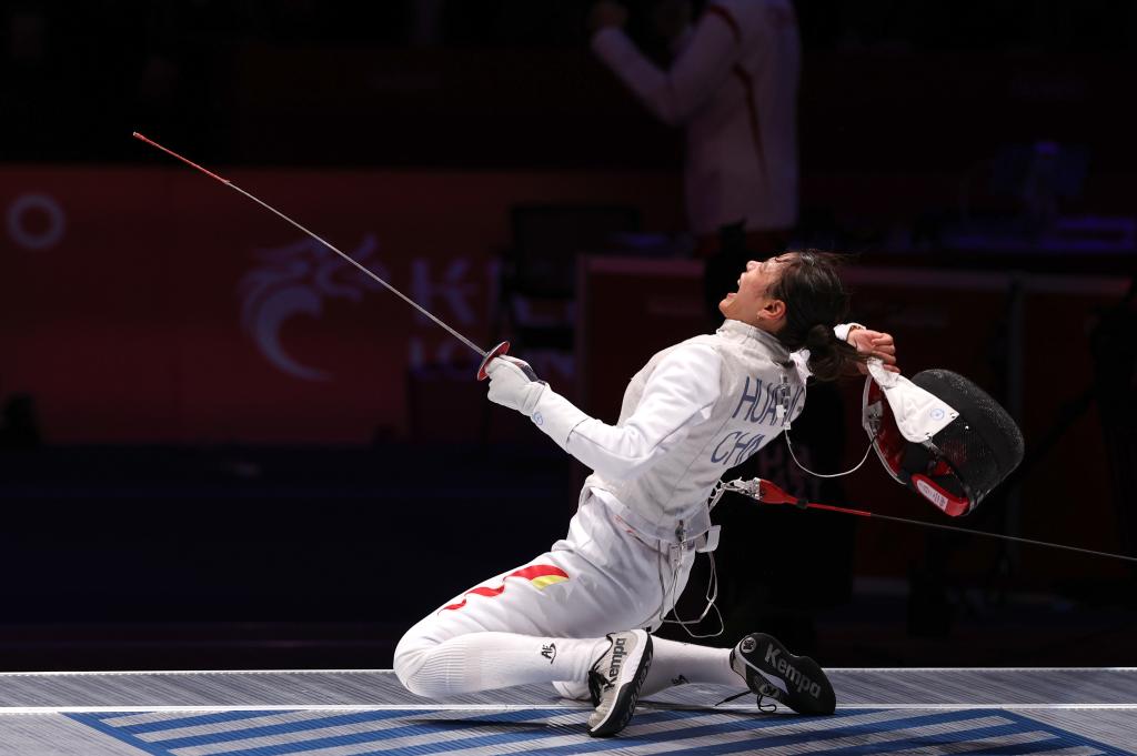 25日,杭州亞運會女花個人決賽中,隨著黃芊芊刺中制勝一劍,顯示器上的比分定格在15:8。這位21歲的中國女花新星,為中國擊劍隊斬獲本屆亞運會首金。