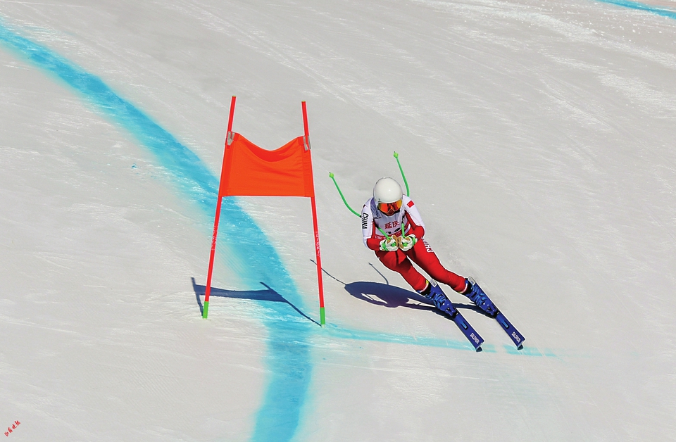 女子滑降比賽冠軍朱天慧在比賽中。山西省體育局供圖