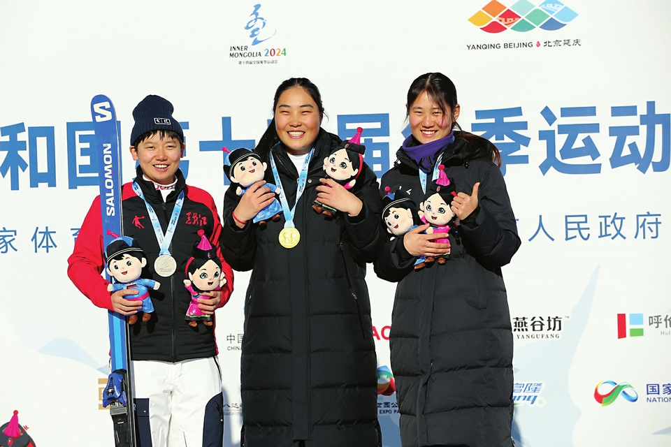 公開組女子滑降比賽頒獎(jiǎng)現(xiàn)場,冠亞季軍合影。