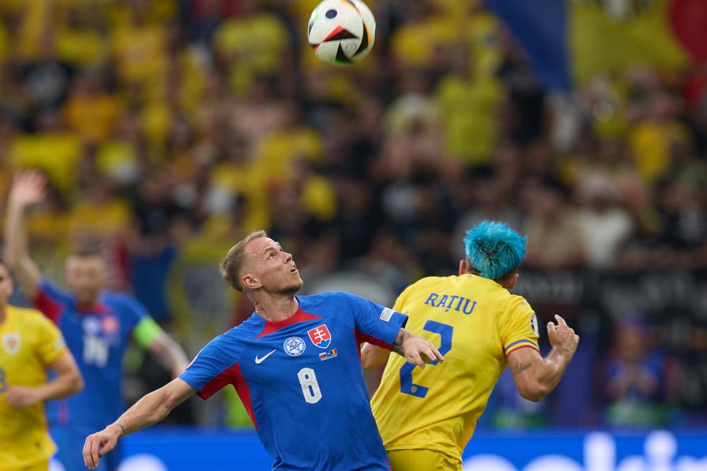 6月26日,斯洛伐克隊球員奧德·杜達(dá)(左)與羅馬尼亞隊球員安德烈·拉蒂烏在比賽中拼搶。新華社記者 孟鼎博 攝
