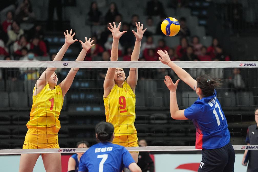 11月27日,山東隊球員李晨瑄(中)、李美君(左)在比賽中攔網(wǎng)。當(dāng)日,在湖南省長沙市賀龍體育館舉行的中華人民共和國第一屆青少年三大球運(yùn)動會排球女子決賽中,山東隊3比0戰(zhàn)勝江蘇隊,獲得冠軍。新華社記者 薛宇舸 攝