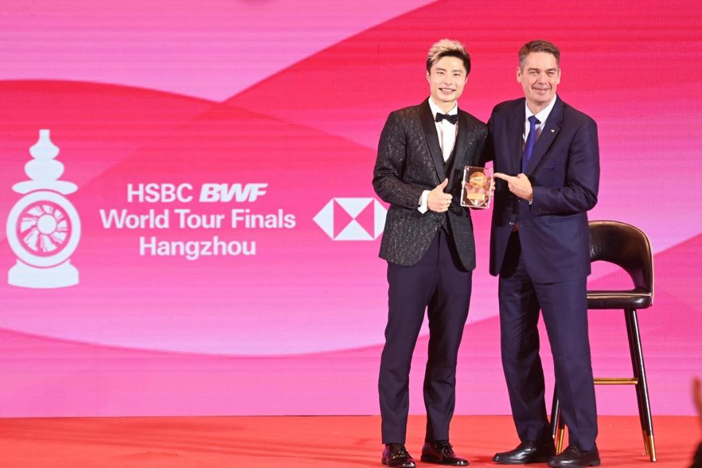 12月9日,世界羽聯(lián)主席拉爾森為獲得年度最佳男子單打運(yùn)動(dòng)員的中國(guó)選手石宇奇(左)頒獎(jiǎng)。新華社記者 黃宗治 攝