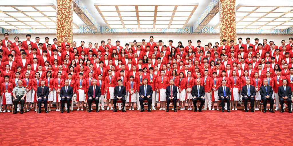8月3日,鄭欽文在巴黎奧運會網(wǎng)球女單頒獎儀式上展示金牌。新華社記者 賴向東 攝 6、習近平接見第33屆奧運會中國體育代表團 8月20日,中共中央總書記、國家主席、中央軍委主席習近平在人民大會堂接見第33屆夏季奧林匹克運動會中國體育代表團全體成員并發(fā)表重要講話。他表示,中國體育代表團的優(yōu)異成績,既是我國體育事業(yè)發(fā)展進步的集中體現(xiàn),也是中國式現(xiàn)代化建設(shè)成就的一個縮影,充分彰顯了新時代中國力量。 在7月26日至8月11日舉行的巴黎奧運會上,中國體育代表團勇奪40金27銀24銅共91枚獎牌,取得我國夏季奧運會境外參賽歷史最好成績。在巴黎殘奧會上,中國代表團取得94金76銀50銅共220枚獎牌,連續(xù)第六次在夏殘奧會位列金牌榜、獎牌榜雙第一。