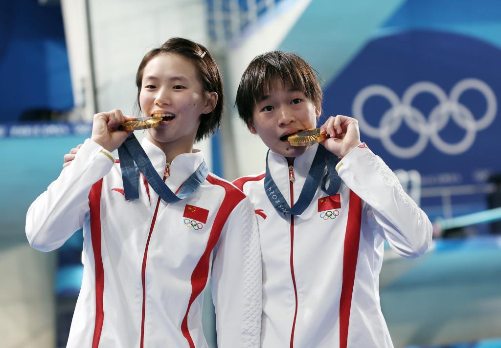 7月31日,冠軍中國選手陳芋汐(左)/全紅嬋在頒獎(jiǎng)儀式上。當(dāng)日,在巴黎奧運(yùn)會(huì)跳水女子雙人十米臺(tái)決賽中,陳芋汐/全紅嬋奪得金牌。新華社記者 張玉薇 攝