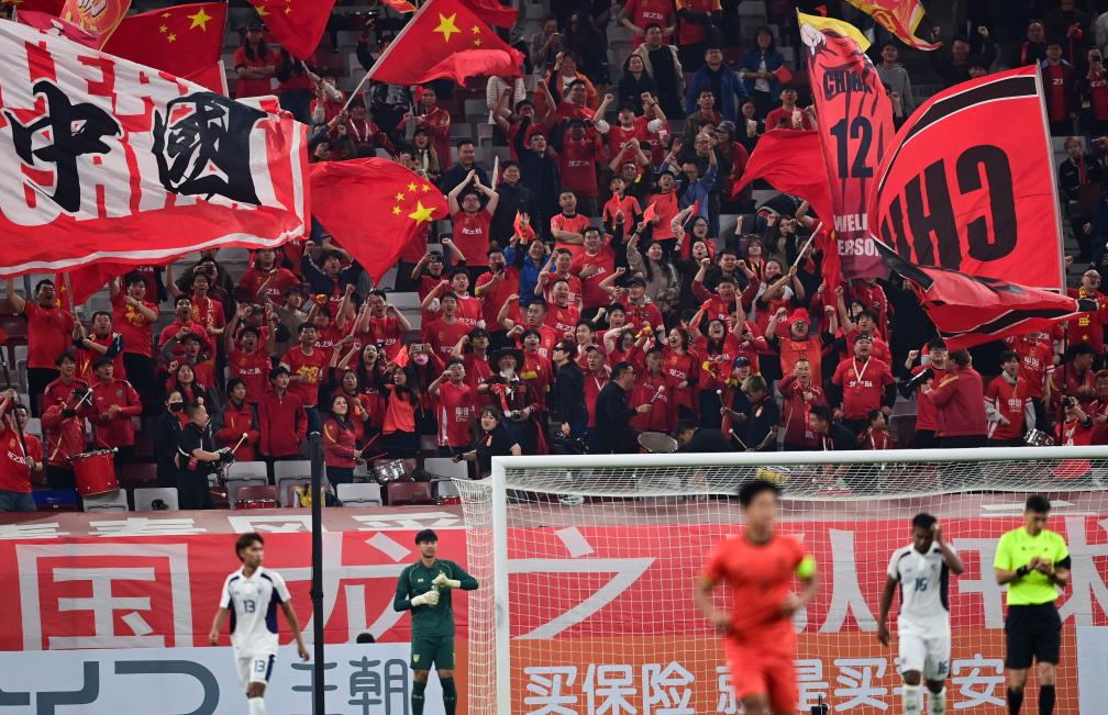3月25日,球迷在中國(guó)隊(duì)進(jìn)球后慶祝。新華社記者 鄒競(jìng)一 攝