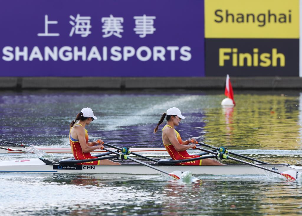 2025年9月26日,陳云霞(左)與張靈在比賽中。當日,在上海舉行的2025年世界賽艇錦標賽女子雙人雙槳A組決賽中,中國選手陳云霞/張靈斬獲銀牌。新華社記者 丁汀 攝
