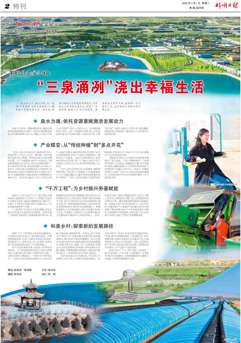 “如今的老泉頭村,環(huán)境優(yōu)美、產(chǎn)業(yè)興旺、村民富裕、村風(fēng)文明,鄉(xiāng)村振興的美好藍(lán)圖正一步步變?yōu)楝F(xiàn)實(shí)?!崩先^村黨支部書(shū)記崔貴祥說(shuō),“未來(lái),我們村將繼續(xù)深挖‘三泉涌冽’這一核心資源優(yōu)勢(shì),拓展鄉(xiāng)村旅游與生態(tài)康養(yǎng)產(chǎn)業(yè),打造更具吸引力的鄉(xiāng)村文旅品牌。同時(shí),將持續(xù)優(yōu)化產(chǎn)業(yè)結(jié)構(gòu),加快農(nóng)業(yè)現(xiàn)代化進(jìn)程,不斷提高農(nóng)產(chǎn)品深加工水平,提升產(chǎn)業(yè)附加值。
