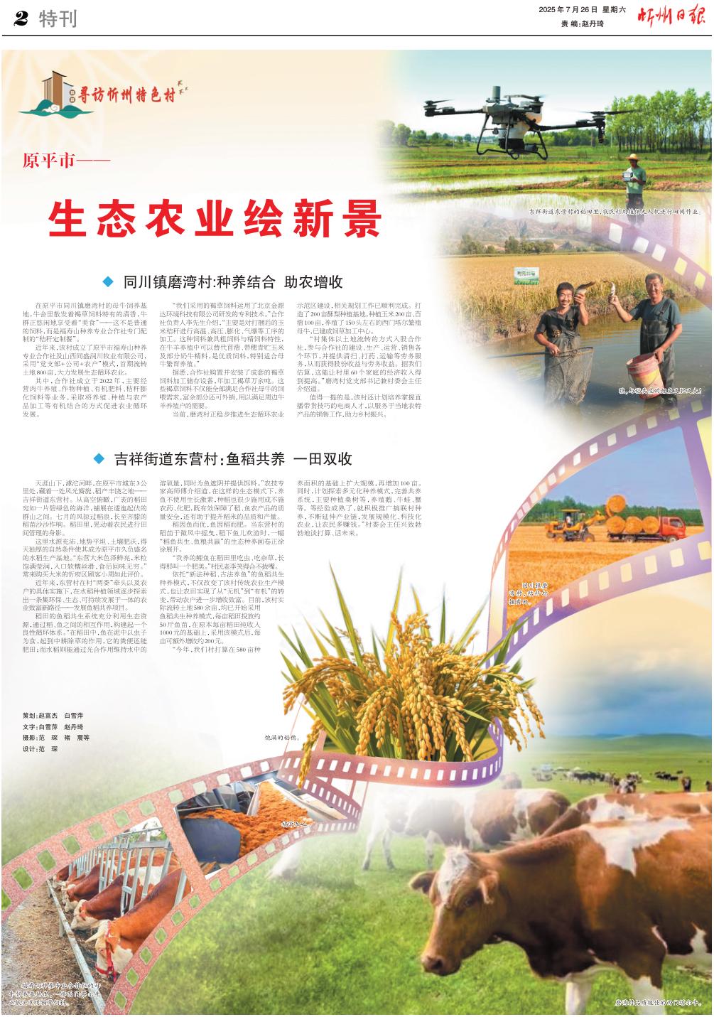 天涯山下,滹沱河畔,在原平市城東3公里處,藏著一處風光旖旎、稻產豐饒之地——吉祥街道東營村。從高空俯瞰,廣袤的稻田宛如一片碧綠色的海洋,鋪展在逶迤起伏的群山之間。七月的風掠過稻浪,長至齊膝的稻苗沙沙作響。稻田里,晃動著農民進行田間管理的身影。