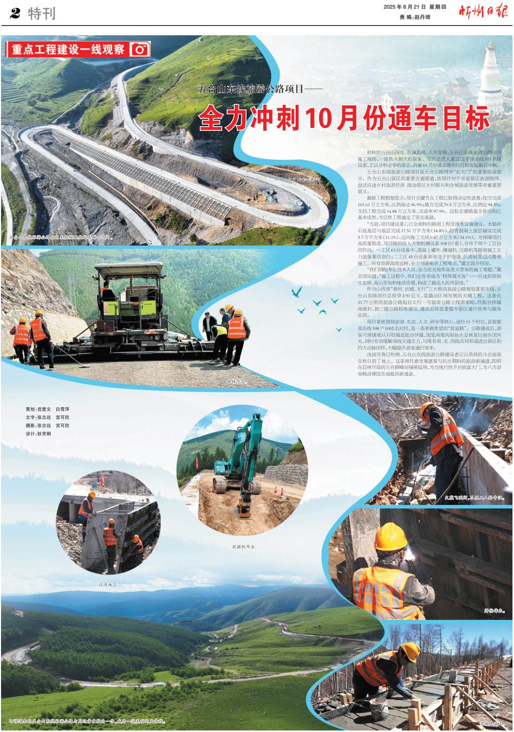 初秋的五臺(tái)山深處,機(jī)械轟鳴,人員穿梭,五臺(tái)山東線旅游公路項(xiàng)目施工現(xiàn)場,一派熱火朝天的景象。項(xiàng)目負(fù)責(zé)人冀志國帶領(lǐng)全線373名建設(shè)者,正以分秒必爭的姿態(tài),向著10月份建成通車的目標(biāo)發(fā)起最后沖刺。