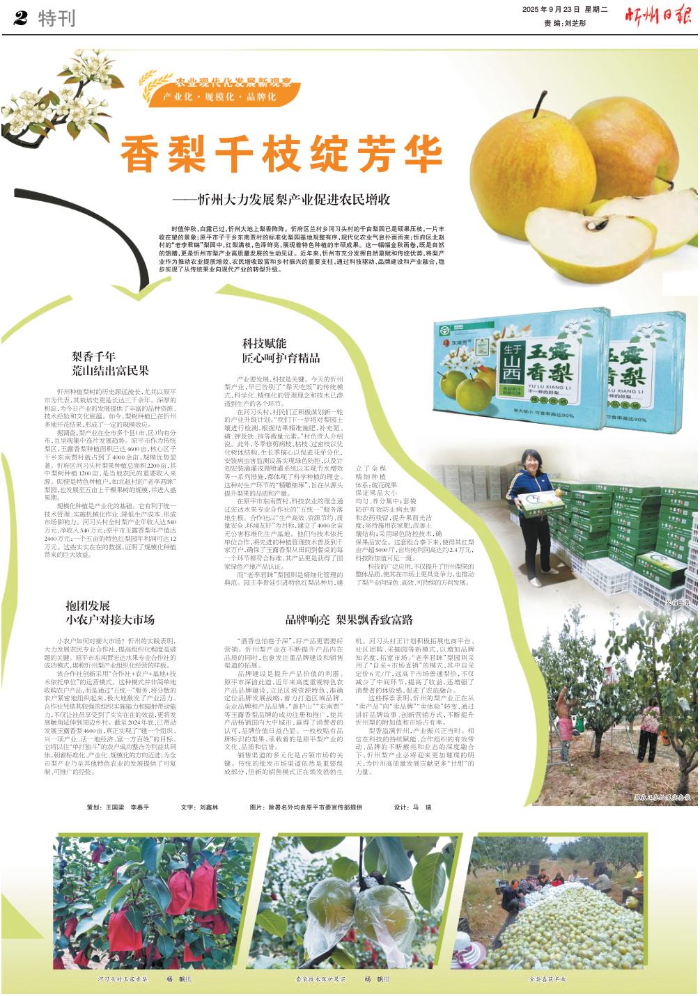 時(shí)值仲秋,白露已過(guò),忻州大地上梨香陣陣。忻府區(qū)蘭村鄉(xiāng)河習(xí)頭村的千畝梨園已是碩果壓枝,一片豐收在望的景象;原平市子干鄉(xiāng)東南賈村的標(biāo)準(zhǔn)化梨園基地規(guī)整有序,現(xiàn)代化農(nóng)業(yè)氣息撲面而來(lái);忻府區(qū)北趙村的“老李君睞”梨園中,紅梨滿枝,色澤鮮亮,展現(xiàn)著特色種植的豐碩成果。這一幅幅金秋畫卷,既是自然的饋贈(zèng),更是忻州市梨產(chǎn)業(yè)高質(zhì)量發(fā)展的生動(dòng)見(jiàn)證。近年來(lái),忻州市充分發(fā)揮自然稟賦和傳統(tǒng)優(yōu)勢(shì),將梨產(chǎn)業(yè)作為推動(dòng)農(nóng)業(yè)提質(zhì)增效、農(nóng)民增收致富和鄉(xiāng)村振興的重要支柱,通過(guò)科技驅(qū)動(dòng)、品牌建設(shè)和產(chǎn)業(yè)融合,穩(wěn)步實(shí)現(xiàn)了從傳統(tǒng)果業(yè)向現(xiàn)代產(chǎn)業(yè)的轉(zhuǎn)型升級(jí)。