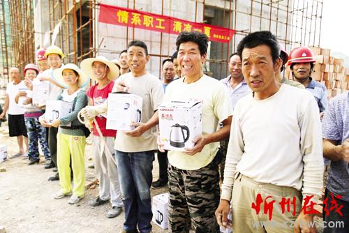 圖為靜樂縣工會為該縣殘疾人康復和托養(yǎng)中心工程施工現(xiàn)場工人發(fā)放熱水壺。