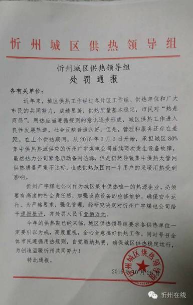 忻州城區(qū)供熱領(lǐng)導(dǎo)組處罰通報