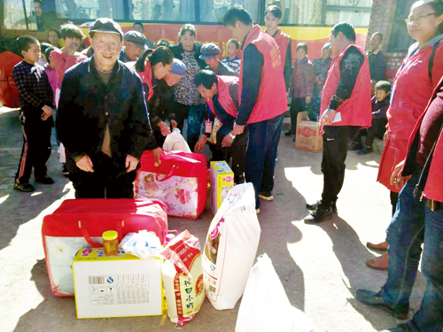 深秋的早晨伴著涼風(fēng),空氣中帶著絲絲冷意,志愿者們乘坐的中巴車緩緩地駛?cè)胩J草溝村。中巴車還沒停穩(wěn),在村口曬太陽的村民就都圍了過來。當(dāng)村民們得知志愿者的來意后,非常感謝志愿者的愛心幫助。此時(shí)大家一鼓作氣將車上帶來的慰問品搬了下來,分類后開始分發(fā)。本次活動主要探望的是該村的13戶孤寡老人,慰問物品包括每人一桶油、一袋面、一袋米以及食鹽、醬油、醋等生活必需品。志愿者還為當(dāng)?shù)氐膬和瘻?zhǔn)備了新書包以及防寒過冬的衣服。經(jīng)過一個小時(shí)的忙碌,慰問品分發(fā)完畢。