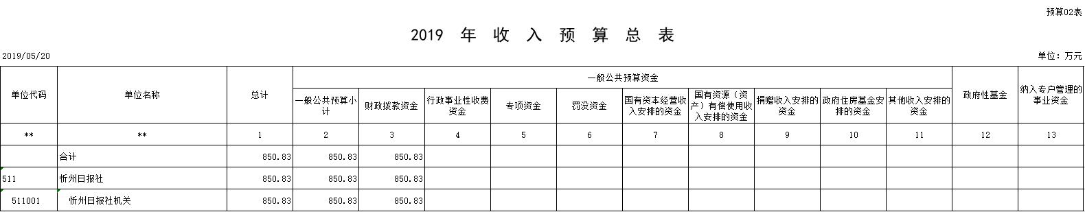 忻州日報(bào)社2019年收入預(yù)算850.83萬元,比2018年增加24.6萬元。