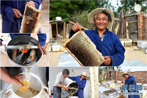 王巨才,男,1949年出生,山西省長治市武鄉(xiāng)縣鳳臺坪村人,2014年被列入建檔立卡貧困戶。2016年,在當(dāng)?shù)卣膸椭?,王巨才和兒子一起學(xué)習(xí)養(yǎng)蜂技術(shù),發(fā)展養(yǎng)蜂產(chǎn)業(yè)。2018年,王巨才銷售蜂蜜收入達(dá)到4萬多元。 右上:王巨才肖像;左上:王巨才在去除蜂板上的蜂蠟;左中:王巨才使用搖蜜機(jī)取蜜;左下:王巨才將蜂蜜裝到瓶子里;下中:王巨才(右)和兒子將搖蜜機(jī)里的蜜倒出;下右:王巨才在整理蜂箱(拼版照片,6月11日攝)。 地處晉東南的山西省長治市,位于由太行山、太岳山環(huán)繞而成的上黨盆地中。在群山中、崖壁上,許多村莊自然條件惡劣,基礎(chǔ)設(shè)施落后,脫貧致富是大山深處人們的迫切心愿。 近年來,一場場脫貧攻堅(jiān)戰(zhàn),在一個個深山村打響。政府全力探索脫貧路徑的同時(shí),山區(qū)百姓因地制宜,靠自己的雙手和智慧走上致富路,交出了一份扎實(shí)的脫貧答卷。 記者在太行山、太岳山一路尋訪,記錄下多位70歲老人的生活。這些共和國的同齡人,親歷了山鄉(xiāng)的巨變,見證著長治山區(qū)脫貧攻堅(jiān)偉大工程的一步步推進(jìn)。 新華社記者 詹彥 攝